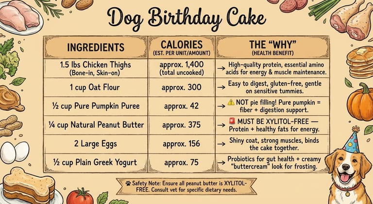 IngredientAmountWhy Itâs AmazingOat Flour1 cupEasy to digest, gluten-free, gentle on sensitive tummiesPure Pumpkin Puree½ cupâ ď¸ NOT pie filling! Pure pumpkin = fiber + digestion supportNatural Peanut ButterÂź cupđ¨ MUST BE XYLITOL-FREE (see safety section below)âââProtein + healthy fatsLarge Eggs2Shiny coat, strong muscles, binds the cake togetherPlain Greek Yogurt½ cup (for frosting)Probiotics for gut health + creamy âbuttercreamâ look