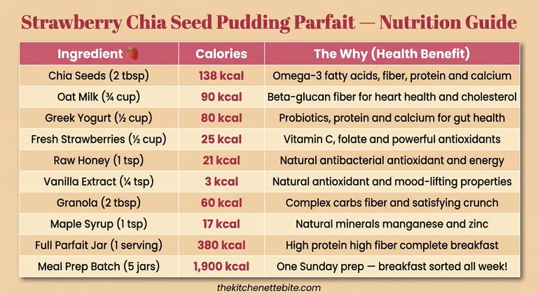 The milk you choose makes a very significant difference in both flavor and final texture. Full-fat coconut milk gives the richest, creamiest, most dessert-like chia pudding — the high fat content creates a pudding that is indistinguishably similar to a rice pudding or panna cotta in texture. Oat milk gives a naturally sweet mild result with a slightly thinner set than coconut milk but is the most popular choice for everyday meal prep because of its neutral flavor and wide availability. Almond milk gives a lighter thinner pudding with a subtle nutty note — use slightly more chia seeds (1 extra tablespoon per cup) to compensate for the lower fat content. Whole dairy milk gives a clean classic flavor and excellent thick set. For the most beautiful layered appearance in a clear jar full-fat coconut milk or whole dairy milk give the most opaque white chia layer that contrasts most dramatically against the red strawberry compote — this visual contrast is what makes the parfait jar so stunning.